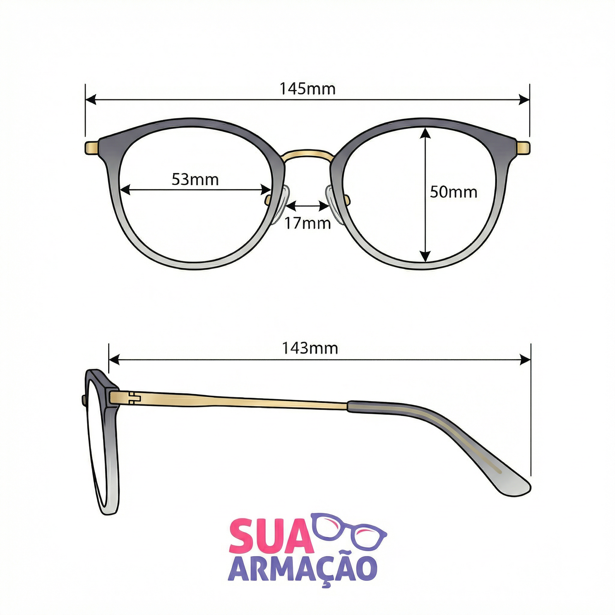 Materiais e características: aro em Acetato Premium translúcido com acabamento em degradê, leve e confortável; ponte e estrutura superior em metal com banho dourado, trazendo mais resistência e um visual sofisticado; plaquetas nasais em silicone ajustáveis para melhor encaixe e estabilidade; hastes finas com núcleo metálico e ponteiras em Acetato Premium, garantindo ajuste firme e uso agradável no dia a dia.