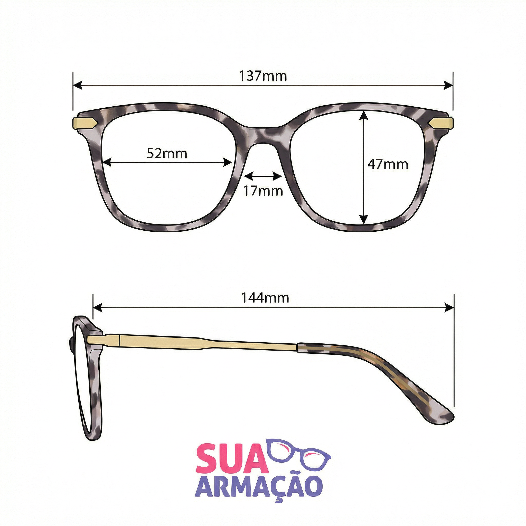 Materiais e características: frente em Acetato Premium com acabamento marmorizado, leve e confortável para o uso diário; hastes em Acetato Premium com ponteiras no mesmo padrão, oferecendo encaixe firme e agradável; detalhe metálico dourado nas hastes e nas dobradiças, que aumenta a resistência e adiciona um toque sofisticado ao visual; design de linhas marcantes com cantos suavemente arredondados, equilibrando presença e elegância.