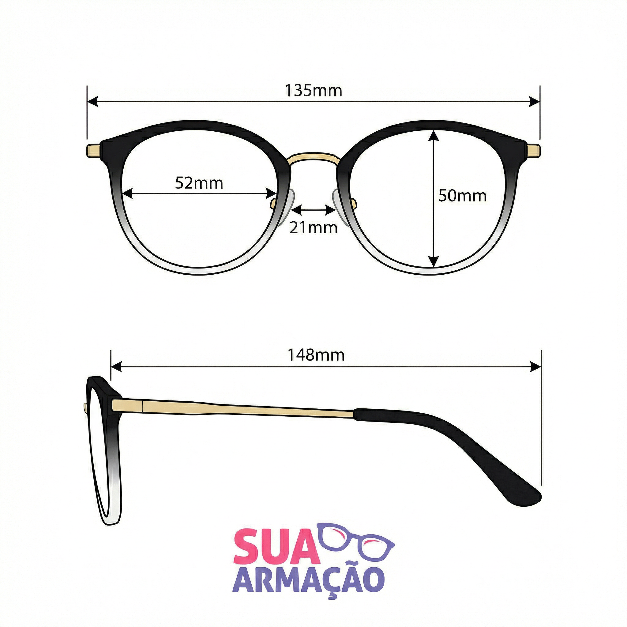 Formato: redondo, com linhas suaves que equilibram as proporções do rosto e trazem um estilo clássico com ar contemporâneo.
