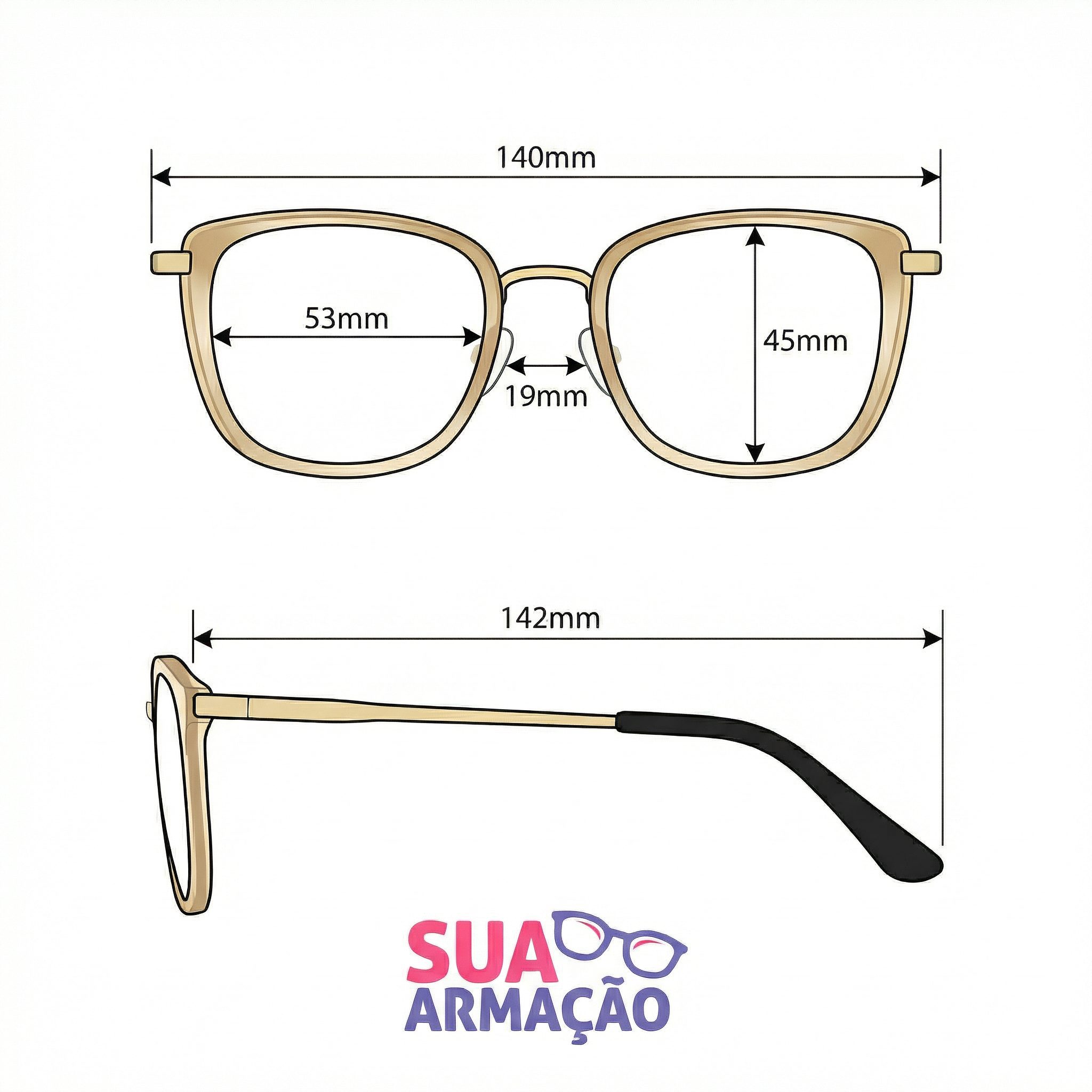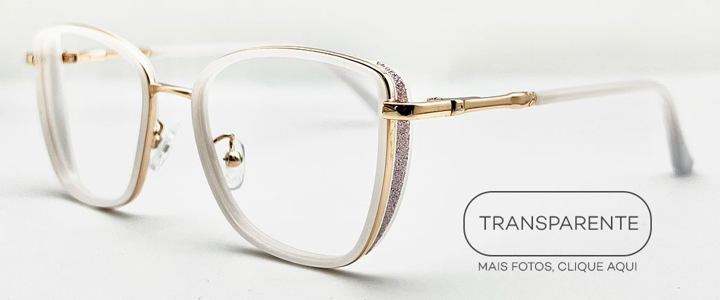 Modelo: óculos de grau estilo quadrado, com aro frontal em Nylon translúcido em tom champagne/dourado e estrutura metálica dourada, trazendo um visual elegante e contemporâneo.