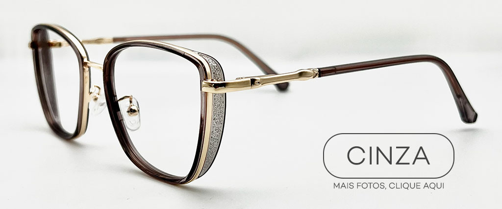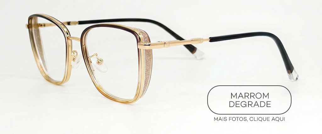 Materiais e características: aro frontal em Nylon translúcido, leve e confortável, com acabamento sofisticado; estrutura e hastes em metal dourado, que aumentam a resistência e dão um toque refinado; plaquetas nasais em silicone ajustáveis para melhor encaixe e estabilidade; ponte metálica com design delicado; ponteiras das hastes com revestimento em acetato na cor marrom para maior conforto no uso diário.