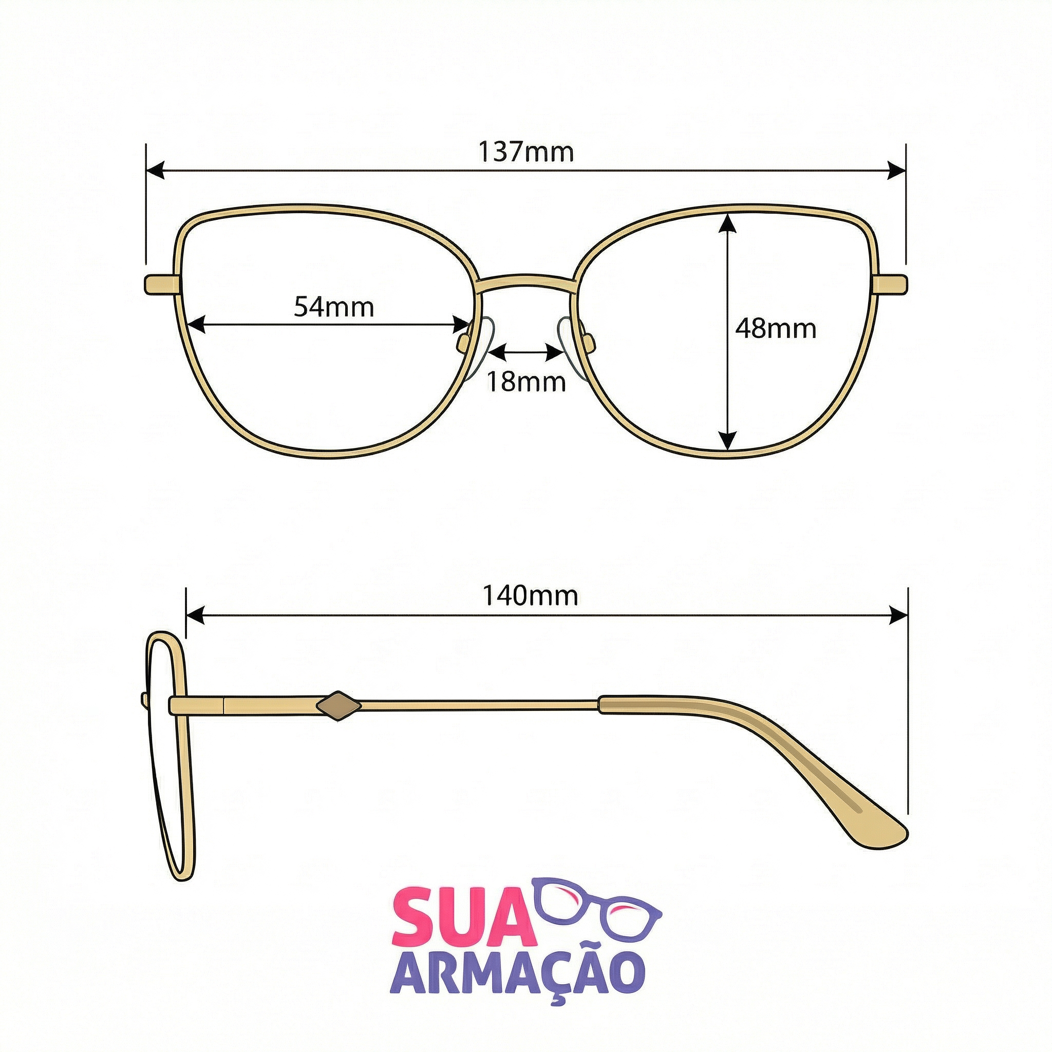 Materiais e características: armação em metal com acabamento dourado, resistente e sofisticada; plaquetas nasais em silicone para melhor encaixe e conforto ao longo do dia; hastes metálicas finas com ponteiras em Acetato Premium, oferecendo estabilidade e um toque premium no contato com a pele; detalhes discretos nas laterais que valorizam o acabamento e reforçam a durabilidade.