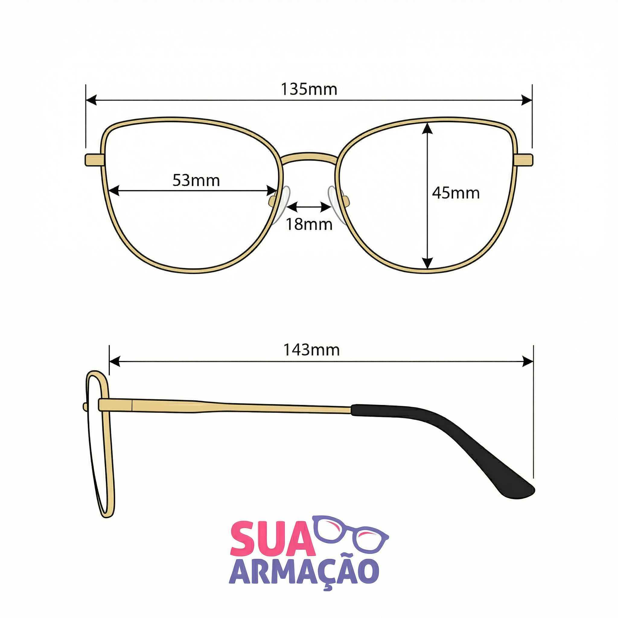 Materiais e características: armação em metal com acabamento dourado, resistente e sofisticada; plaquetas em silicone para melhor apoio no nariz e maior conforto ao longo do dia; hastes metálicas finas com ponteiras em Acetato Premium para encaixe mais confortável e firme; detalhes discretos nas laterais que valorizam o visual com um toque premium.